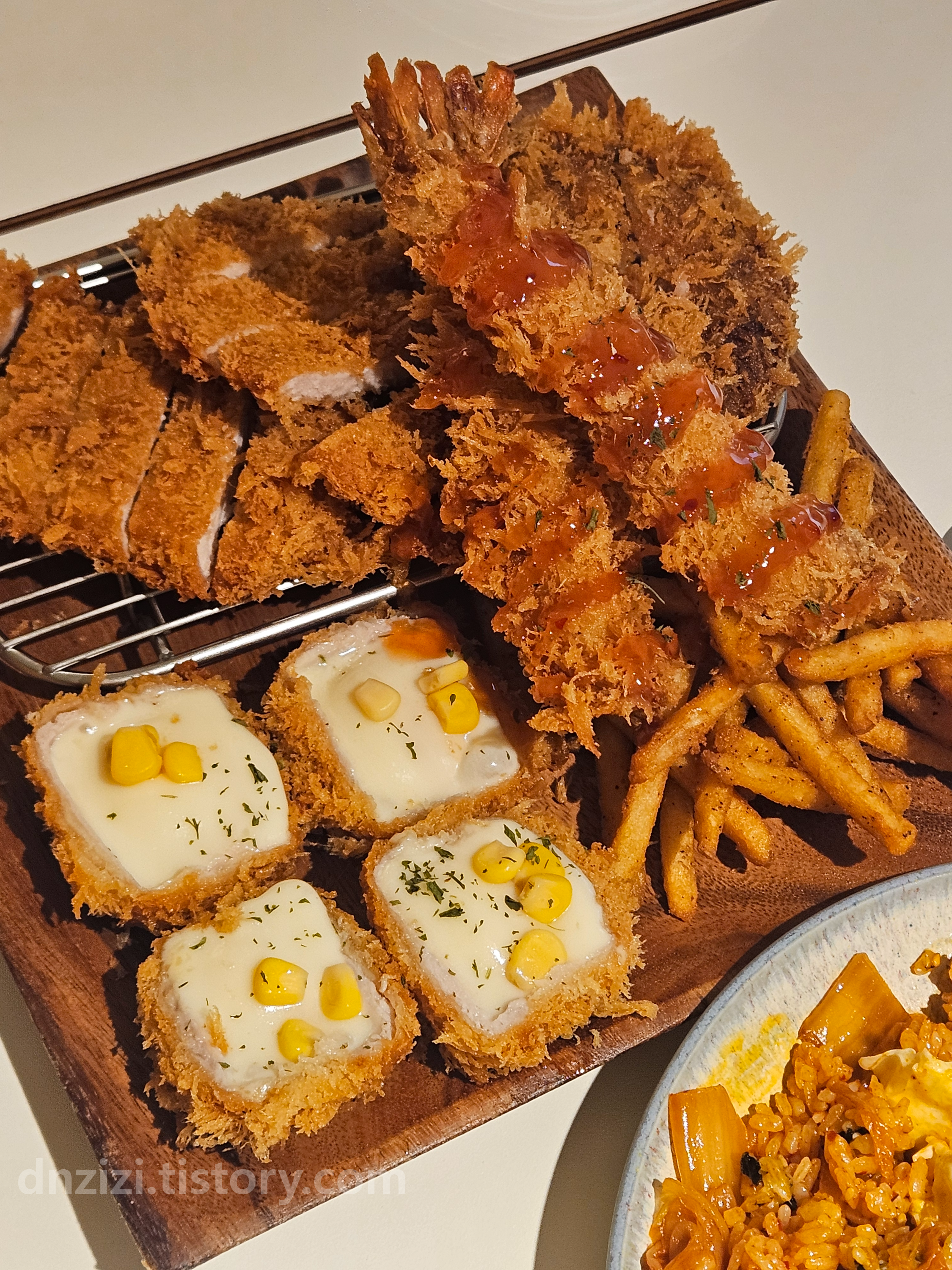 돈까스2, 멘치까스1, 새우튀김2, 큐브치즈돈까스4ps, 감자튀김