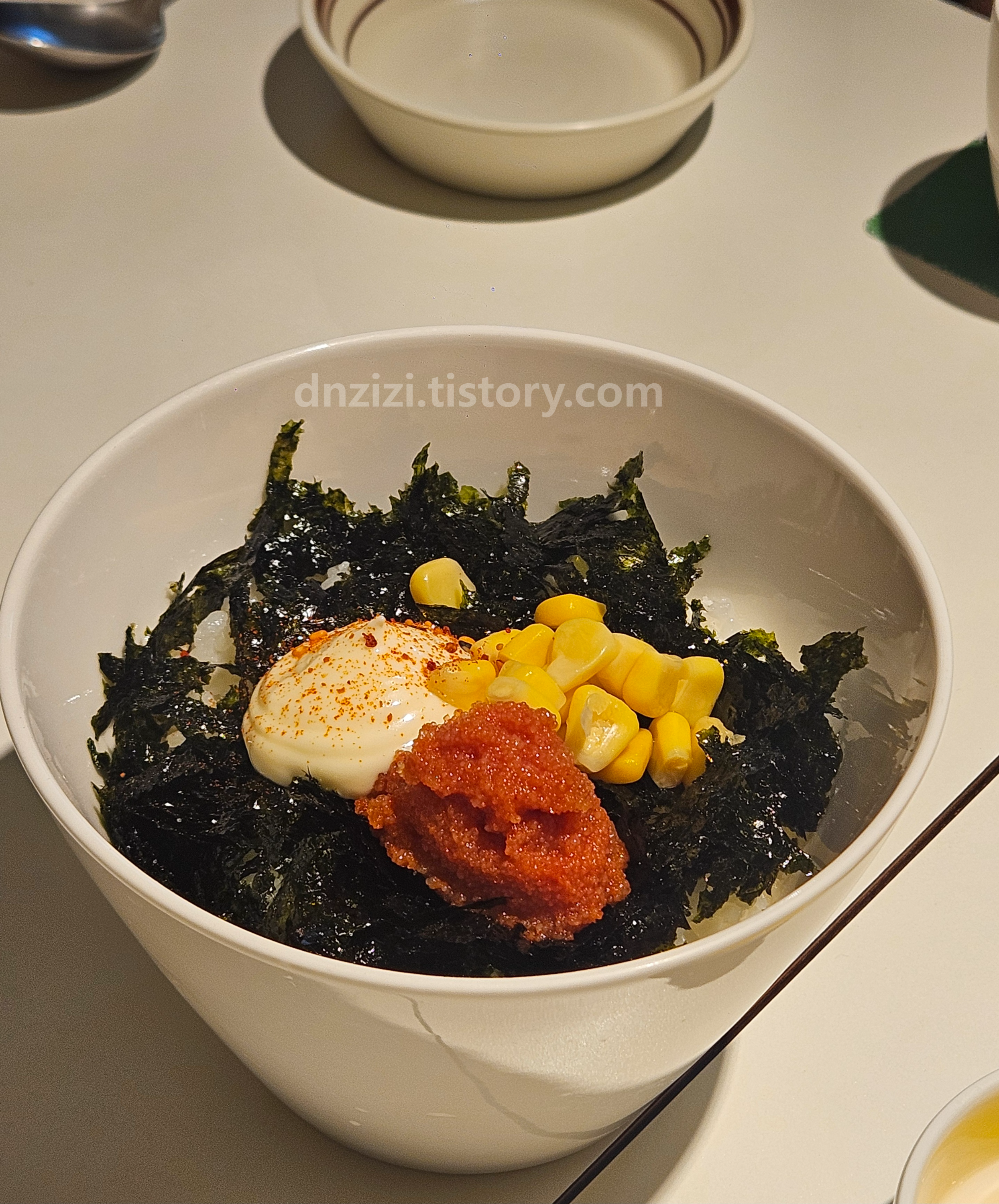 제일 먼저 사이드 메뉴인 명란마요덮밥이 나왔어요.