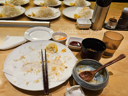 그리고서 레몬즙 짜서도 먹고 와사비 찍어먹고 소스도 먹어봤는데